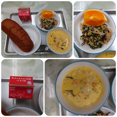 今日の給食は、「黒ロールパン 牛乳 かぼちゃのシチュー ひじきと枝豆のサラダ オレンジ」でした。