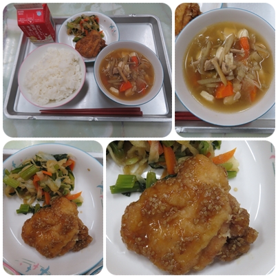 今日の給食のメニューは、「ごはん 牛乳 けんちん汁 鶏肉のてりかけ じゃこなっぱ」です。