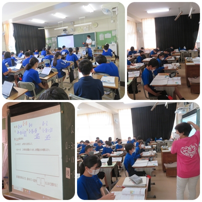 国語では、文法の修飾語について考えました。数学では式の値を考えました。そのために、文字の式、例えば、χ=2のとき、「4χ」の値を求めるには、「4χ=4×χ」というように、数字に戻すときにかけるの記号「×」を戻して計算することが大切であることを考えました。