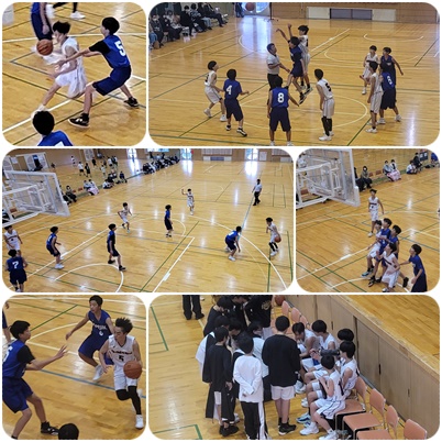 本校の男子バスケットボール部が挑みました。最初は、寒さの影響かそれとも緊張からか動きが硬く、シュートもリングに嫌われる場面も見られましたが、第1クオーターの半ばから、体も温まりいつもの動きに。少しずつ自分たちのペースをつかみ、見事勝利をおさめました。