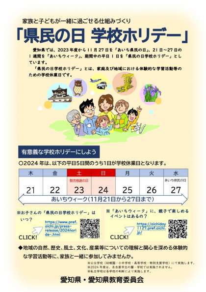 今年度の『県民の日学校ホリデー』は11月22日(金)です。この日は学校が休業日となります。また、部活動もありません。