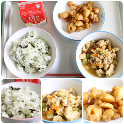 今日の給食は、『わかめごはん・牛乳・高野豆腐の卵とじ・大豆とジャガイモのあまからあえ』でした。