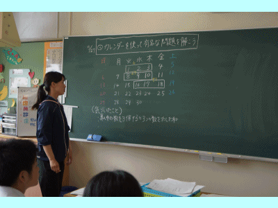 上段,数学。カレンダーの数列から規則性を見つけ出す問題。ほとんどの生徒が,