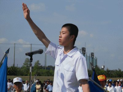 5月26日(日)に瀬戸市民祭の総合開会式が瀬戸市陸上競技場で行われました。瀬戸市内には体育協会に所属するそれぞれの協会が24あります。毎年順番にその協会が選手宣誓をすることになっています。今年は、卓球協会の順番でした。24年に1回のチャンスです。そこで選ばれたのが水無瀬中学校の坂崎君でした。私も、総合開会式に参加していて彼の宣誓に感動いたしました。メリハリのある堂々たる姿勢、マイクがなくても会場に響きわたる迫力、そして、宣誓の内容・・・・どれをとっても「すばらしい」につきます。宣誓を受けた瀬戸市長も思わず「おう」と感嘆の声をもらしてみえました。姿勢や迫力は文章では表現できませんので今朝の全校集会に再び選手宣誓をやっていただきました。以下に内容を載せます。