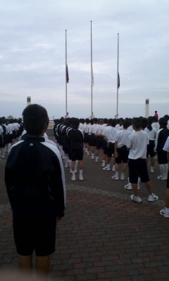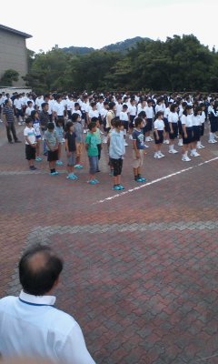 掛川小学校5・6年生と一緒に朝の集いを行いました。この後、朝食、掃除、退所式を行い潮干狩りに向かいます。