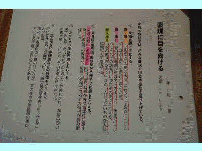 比喩表現(直喩,隠喩,擬人法)についてプリントで学んだ後,それぞれ近くのクラスメートに説明します。