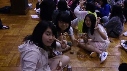 カレーライスをたべてから、再び活動した食べ盛りの生徒たち。今日の夜食は、焼おにぎりとリンゴジュースです。
