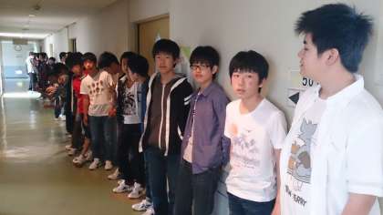 昨日天候が悪かったため 今日の朝の集いは体育館で行われます。廊下に整列し 全員で移動します。