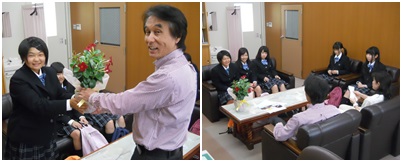本校卒業生の聖カピタニオ女子高等学校の1年生が、創立記念日の式典後にお花を持って訪れました。
