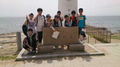砂浜を歩いて、Uターン地点の野間灯台に到着です。