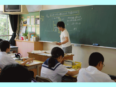 「代入」の概念を考えます。生徒たちは,画像のとおり,前のめりの姿勢が多く,授業によく集中しています。後ろで教育実習生が観察して,何が生徒たちをこうした姿勢にさせているのかを注意深く見ています。