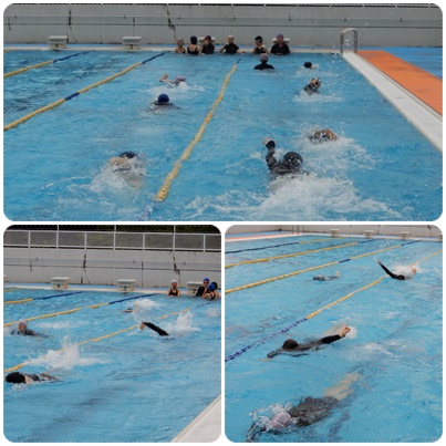 3年生女子の体育です。今日から水泳の授業が始まりました。あいにくの天気ですが、プールの中の水温は高く、生徒は「少し寒い」や「水の中は温かく楽しい」と言っていました。クロールや平泳ぎで25mを何本も泳いでいました。