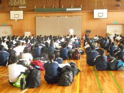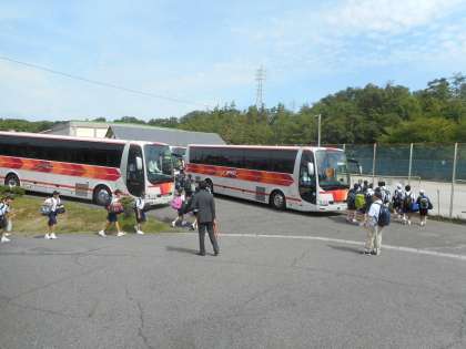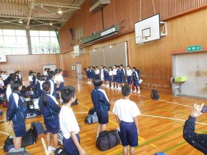 6月19日(火)から2泊3日で、2年生が野外活動に出かけます。朝、体育館で出発式を行った後、バスに乗車して一色港に向かいました。