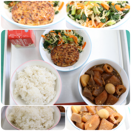 今日の給食は、『麦ごはん・牛乳・みそおでん・豆腐ハンバーグのたれかけ・じゃこなっぱ』でした。