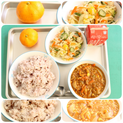 今日の給食は、『五穀ごはん・牛乳・ドライカレー・イカリングサラダ・みかん』でした。