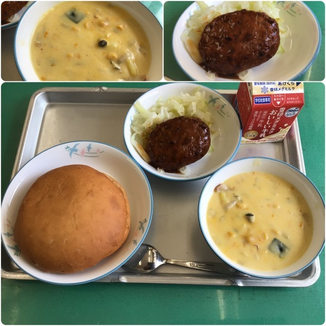 今日の給食は、『サンドイッチバンズパン・牛乳・きのこチャウダー・照り焼きハンバーグ・ボイルキャベツ』でした。 -