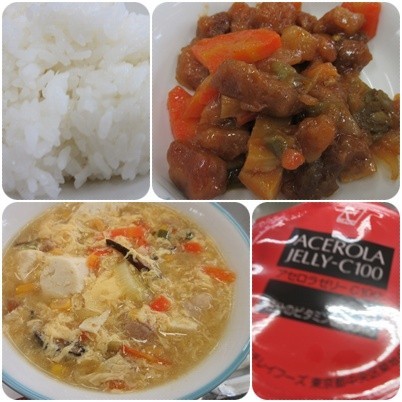 今日の給食は、『ごはん・牛乳・卵入りコーンスープ・酢豚・アセロラゼリー』でした。