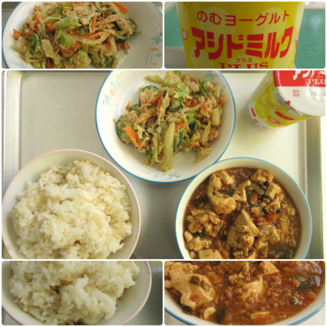今日の給食は、『玄米ごはん・発酵乳・マーボー豆腐・バンバンジーサラダ』でした。