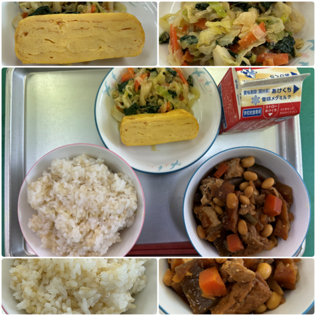今日の給食は、『玄米ごはん・牛乳・鉄火みそ・厚焼き卵・アーモンドあえ』でした。