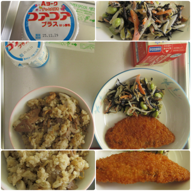 今日の給食は、『まごはやさしいきつねごはん・牛乳・あじフライ・ひじきと枝豆のサラダ・ヨーグルト』でした。