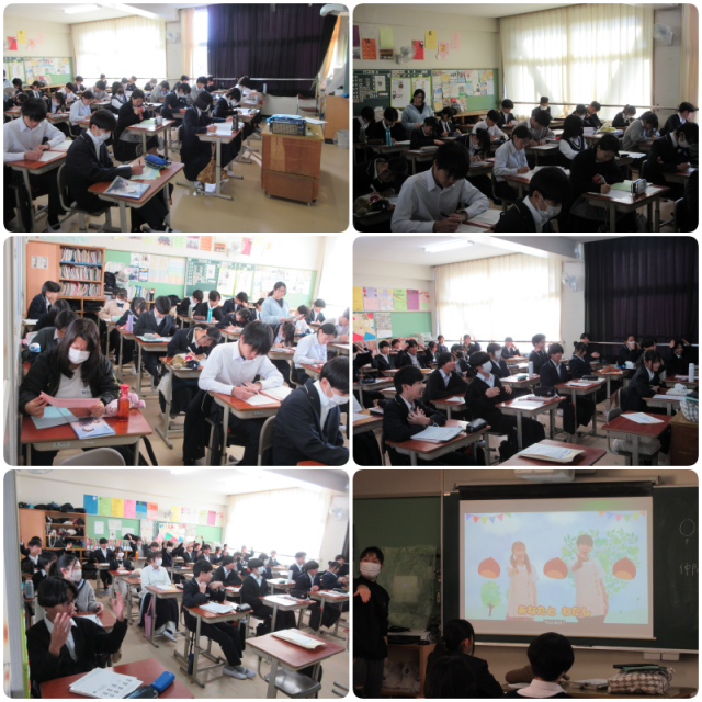 英語の授業では、クラスでアンケートを実施し、その結果をもとに各自がテーマを決め、グループ内で英語による発表を行いました。