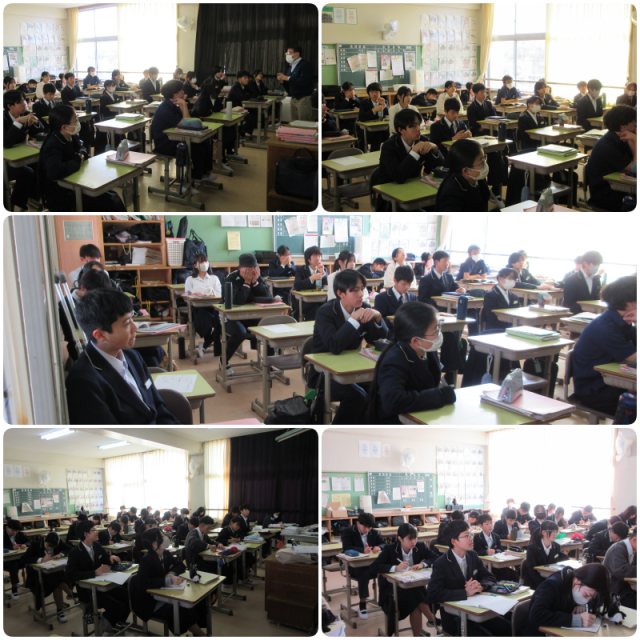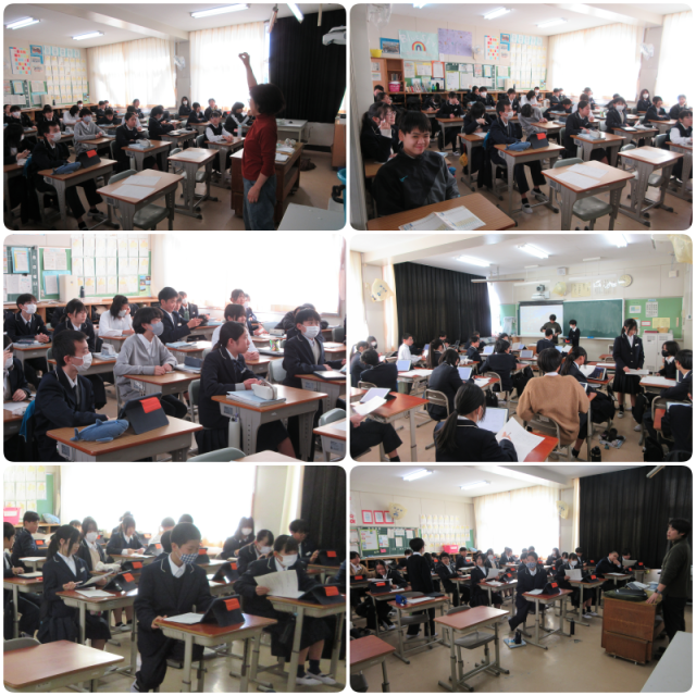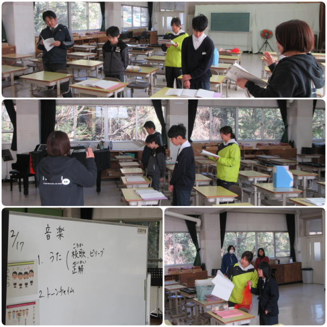 音楽の授業では、卒業に向けた合唱やトーンチャイムの練習を行いました。3年生の数名は本日、受検に挑んでいます。それぞれの場所で、皆一生懸命に頑張っています。