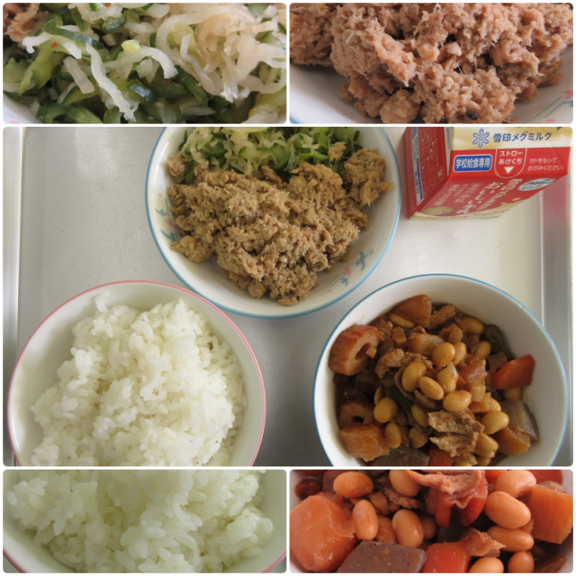 今日の給食は、『ごはん・牛乳・鉄火みそ・魚のそぼろ・きゅうりとたくあんのあえもの』でした。