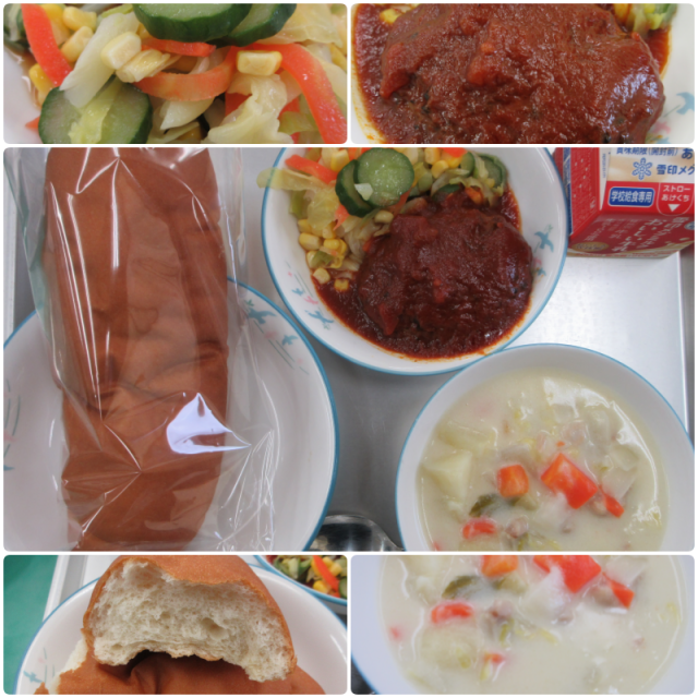 今日の給食は、『あいちの米粉パン・牛乳・白菜とカブのクリームシチュー・ハンバーグのトマトソースかけ・フレンチサラダ』でした。