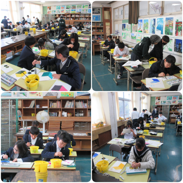 道徳の授業では、2年後の自分に向けて手紙を書きました。また美術の授業では、立方体への光の当たり方を意識しながら、配色を工夫して丁寧に色を塗りました。 -