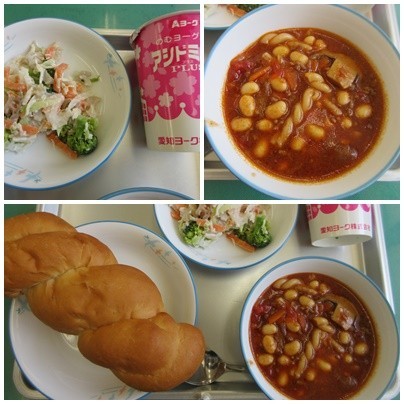 献立は「ツイストロールパン、パスタと大豆のミートソース煮、れんこんのサラダ、発酵乳」でした。1年間、おいしい給食に感謝していただきましょう。