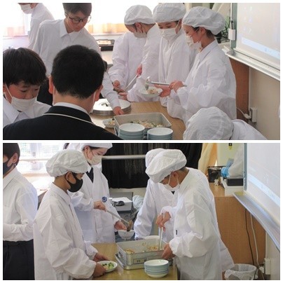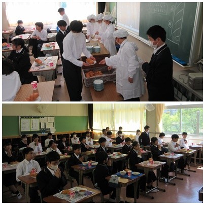 本日から給食が始まりました。初日はカレーライス?と思っていた生徒もいましたが、パンであったことで、配膳もスムーズに行うことができました。配膳を終えた後は、静かな雰囲気で給食を食べていました。