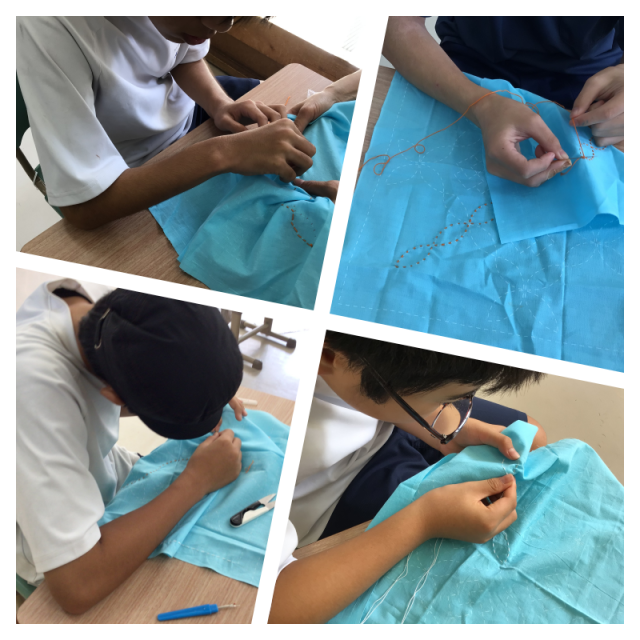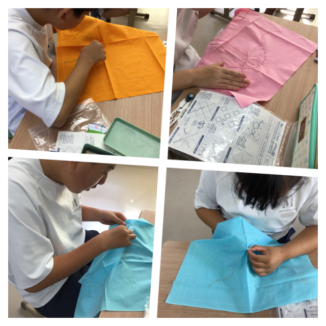 美術と家庭科の授業風景です。デザインカッターを使って細かい切り絵、刺繡用の針と糸を使って刺し子、集中して取り組む姿が素敵です。