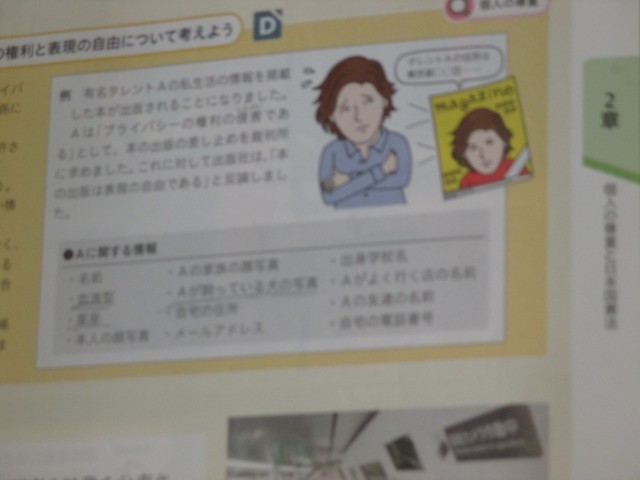 3年の社会は新しい人権について。有名なタレントの情報は雑誌にどこまで載せていいのかを個人で考えた後、グループで意見交換です。