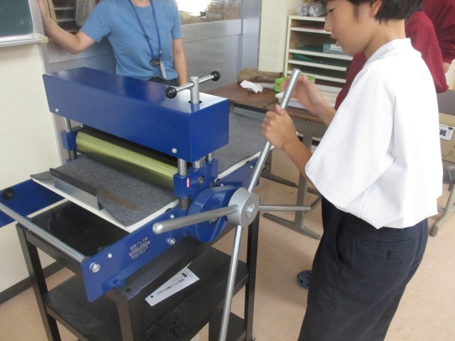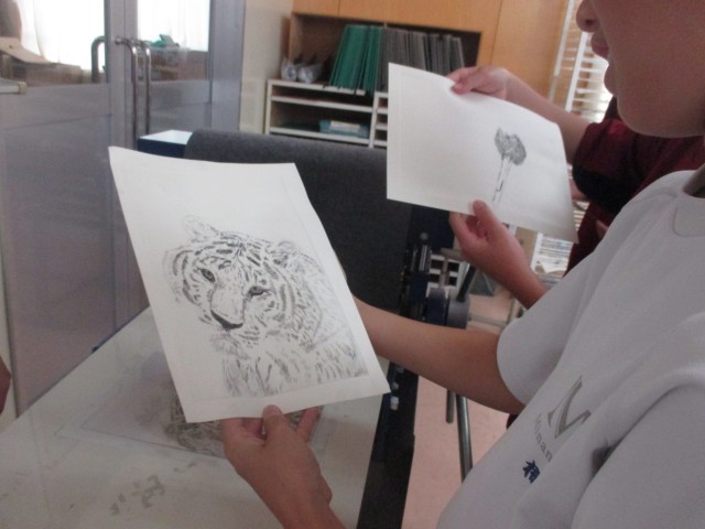 いよいよドライポイントの印刷です。インクのふき取り具合で随分作品の仕上がりが変わります。プレス機にかけ、作品のでき上がり。この後の修正も大切です。