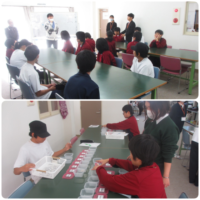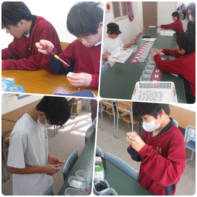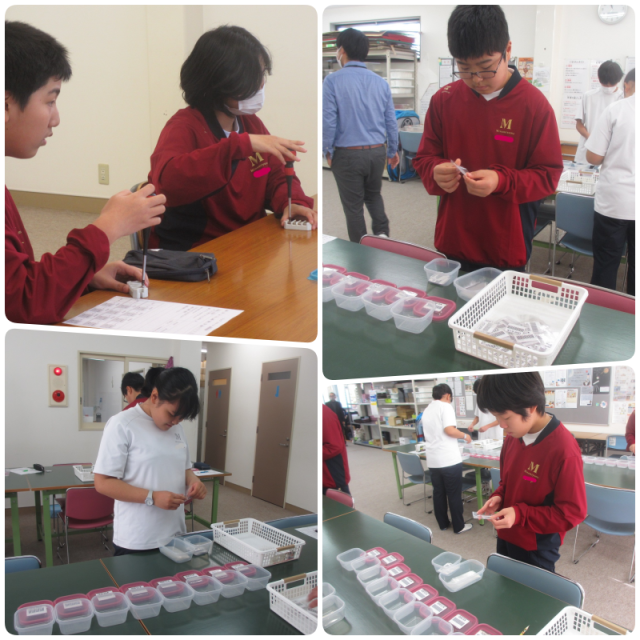 職場体験に行ってきました。1、2年生は、事業所の方から部品の組み立て方を学び、自分が作ったものや個数を自分自身でチェックしていきました。3年生は、事業所の仕事のお手伝いをさせていただきました。商品を検品しながら袋から出し、おみくじを丁寧に入れていく細やかで根気のいる作業でした。みんな2時間集中して取り組むことができ、終わった後の「やりきった」表情が印象的でした。