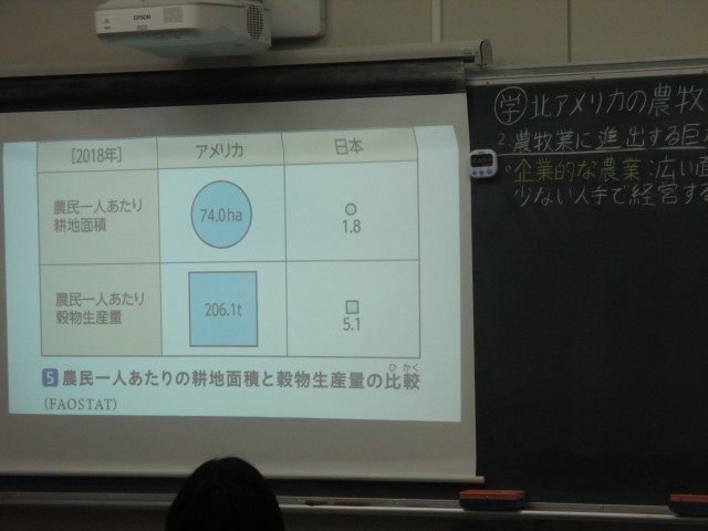 農民一人当たりの耕地面積と穀物生産量をアメリカと日本で比較している社会の授業です。「効率的だと心がこもっていない」とつぶやいた生徒がいました。考えさせられますね。