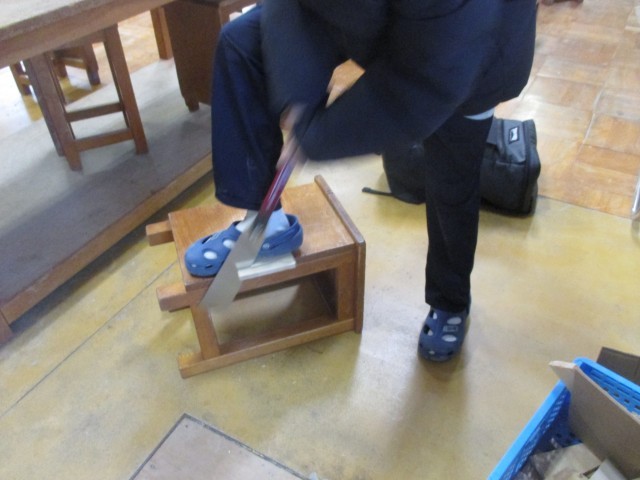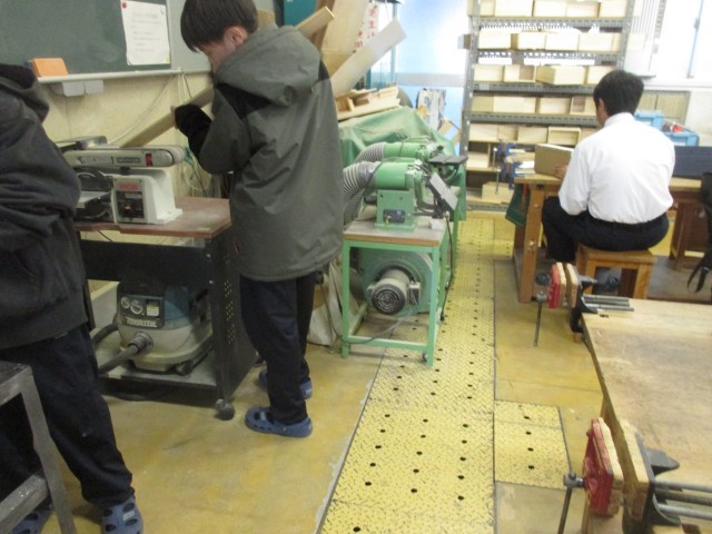 木材加工に励んでいる生徒です。上の写真はコースターの完成です。