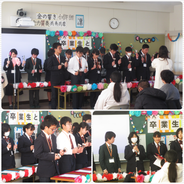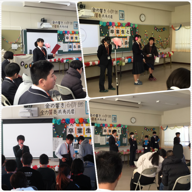 A組卒業生と恩師の先生を招待し、「卒業生と語る会」を行いました。卒業生が、今していること、進学先での様子などを話してくれました。司会進行、ハンドベルやトーンチャイムの発表、お楽しみ会などたくさんの準備して臨んだ生徒たちと出席者との温かな交流となりました。