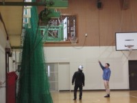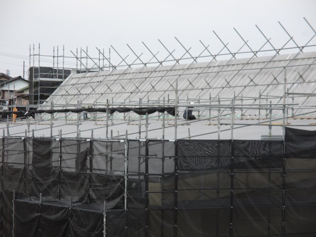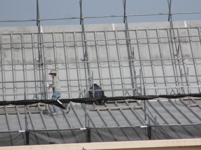 体育館の空調のために断熱効果のある塗料を屋根や外壁に塗っているところです。高所恐怖症の方にはつらいでしょうね。