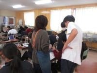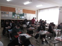 1年生技術では、丈夫な製品を作るため、構造の工夫をグループで話し合います。四角いフレームに半紙をつけて少しでも丈夫にして、どれくらい丈夫になったのか実験していきます。