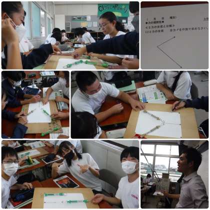 角度によって「力」がどのように合成されたり、分解されたりするのか確かめる実験です。実験の後にプリントや問題集の問題に取り組んでいました。