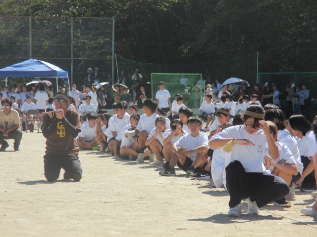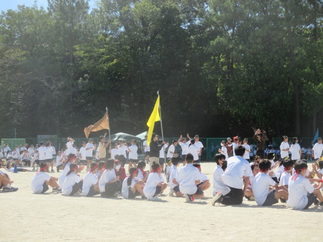 クラスみんなでバトンをつなぐ大リレー。2年の大リレーが終わって次の出番は1年生。その前にクラスで円陣。いい光景です。