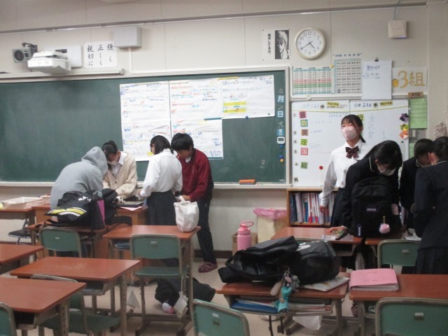 授業後の合唱練習の様子です。学年を超えた合唱の聞きあいをしているクラスもあります。普段聞いていない人のアドバイスも欲しがる頃ですから。