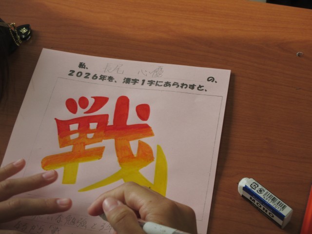 2026年を表す漢字をピンクの紙にデザインしています。一番下の写真は、後ろの掲示板。2025年を表す漢字は黄色の紙に。字の変化も楽しみです。