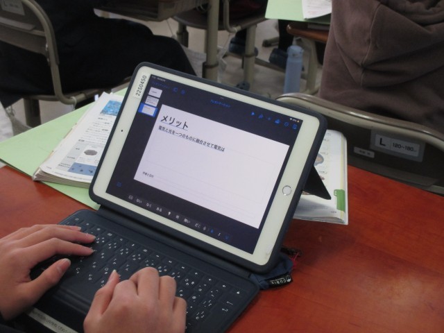 光・音・力を学習した1年の理科。これまで学習したことを物理的にとらえ、プレゼンテーションのアプリでまとめます。