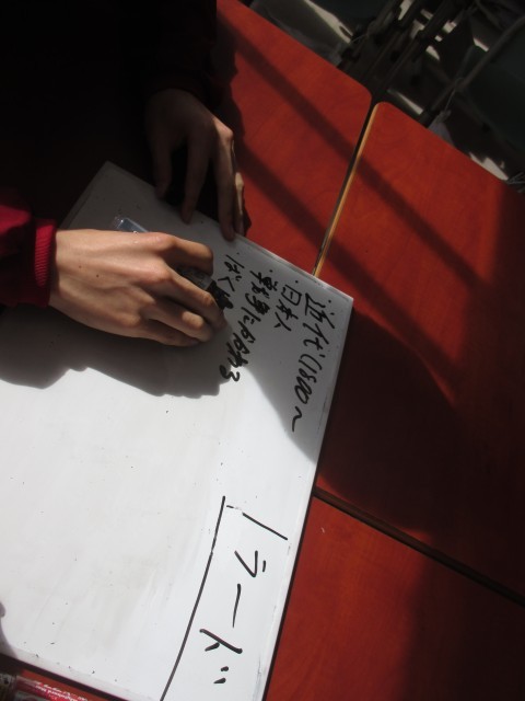 社会科では人物当てクイズ。教師があらかじめ歴史上の人物をホワイトボードに記載。班から一つずつ質問が。「近代以降の人ですか?」「戦争が関係しますか?」「薩長の人ですか?」「ふくよかな人ですよね?」「あ~」