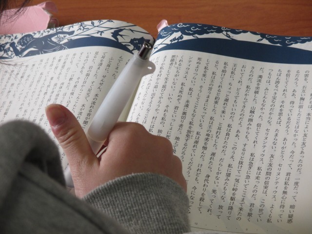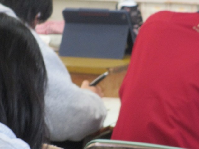 走れメロスの音声を聞いている2年の国語です。内容を理解するために聞いています。中には自信の漢字がでてくるとフリガナをつけている生徒の姿も。こういう非認知能力が身につくメカニズムが分かるといいな。プラスワンを心掛けるご褒美なのかな?!
