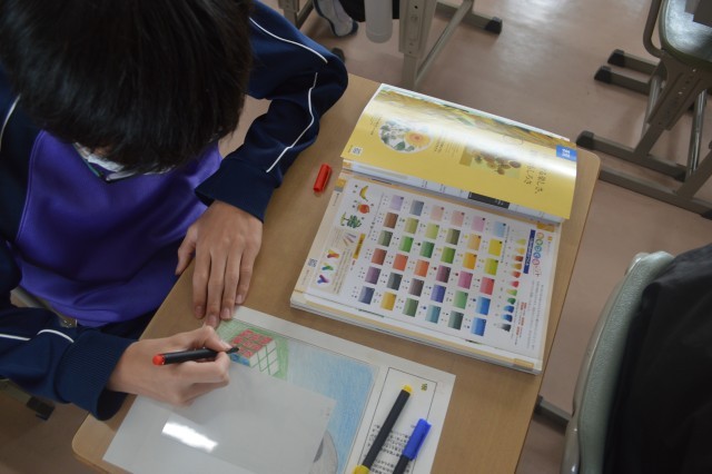 美術では、思い出を形に「中学3年間の記憶」という単元で、透明なアクリル板に、赤・青・黄色のペンを使って点描しました。色鉛筆で配色計画したアイデアスケッチをもとに、1つ1つの点を黙々と真剣に制作をすすめました。フレームに入れた作品完成が楽しみです。