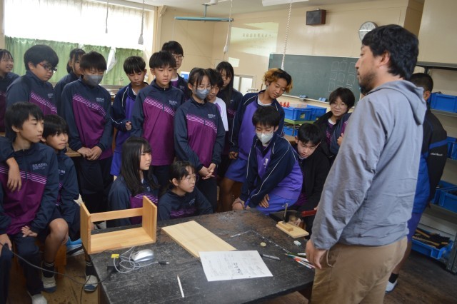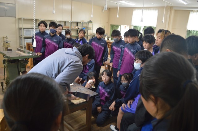 1年生の授業では、のこぎりを使った木工作品づくりに取り掛かっていました。道具の使い方や注意事項の説明をしっかりと聞いた上で、慎重にのこぎりを手に取って切削していました。