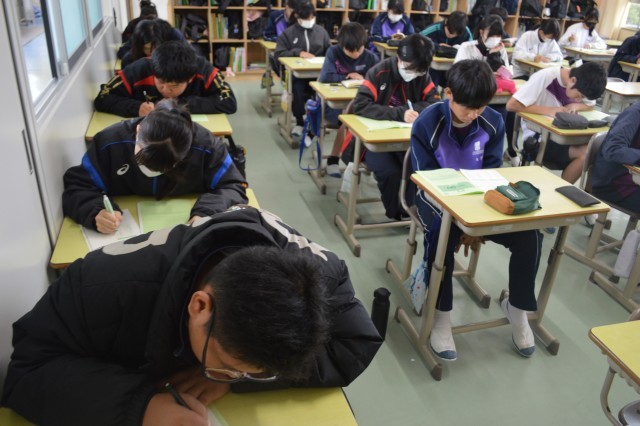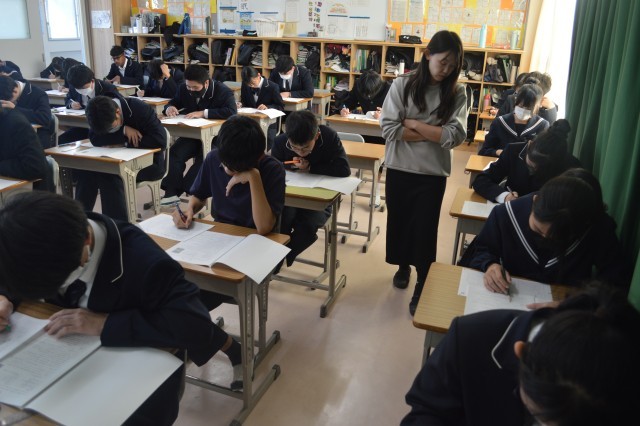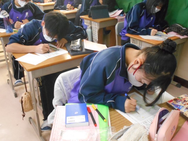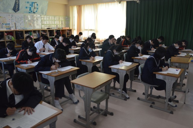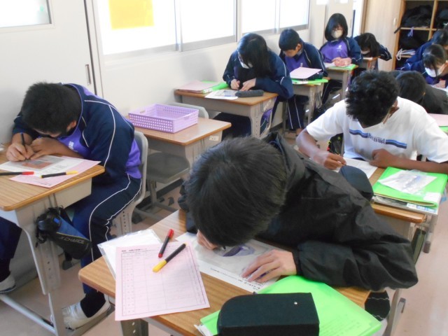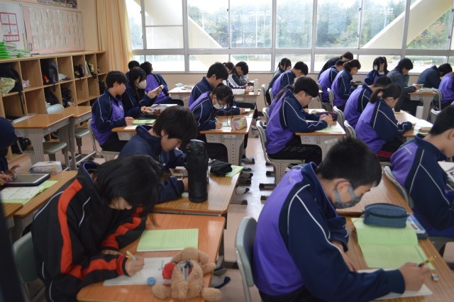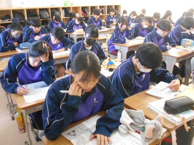 今週、3年生は実力テストと三者懇談が控えています。今の適性や実力を知り、希望と照らし合わせて進学・就職先を絞っていく時期です。今日、3年生は実力テストを受けました。テストの結果は、客観的な資料として今後の進路相談に活用していきます。先週、合唱コンクールを終えたばかりですが、3年生はすっかり学習モードに切り替わっているようです。